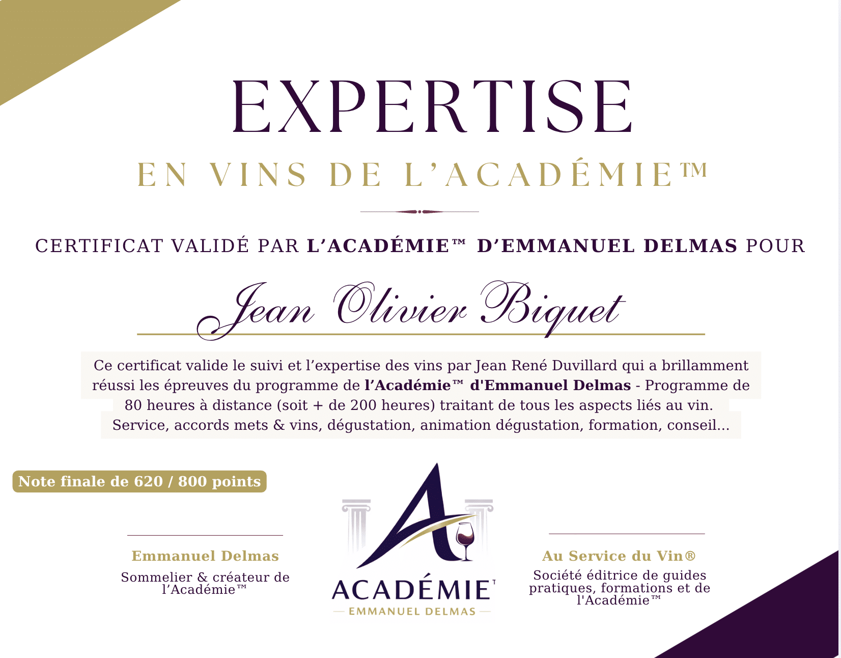 "L' Académie : passez d'amateur à expert en vins"® est une marque déposée à l'INPI. Au Service du Vin, la Société éditrice d'Emmanuel Delmas est un Organisme de formation enregistré sous le numéro 11922848892 auprès du préfet des Hauts de Seine.